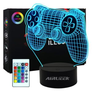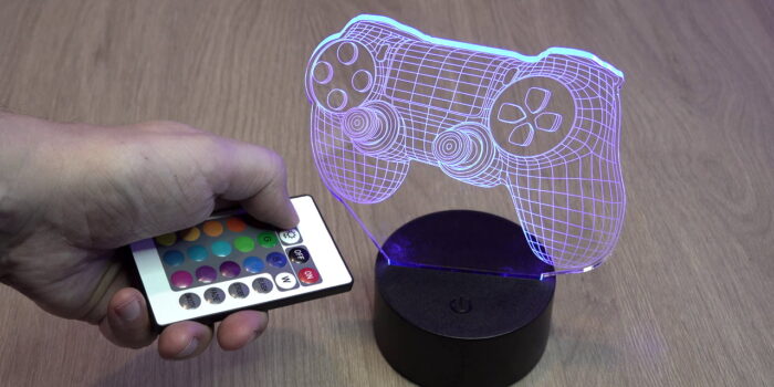 Ensuite je vous propose d’égayer un peu votre décor, car tout streamer qui se respecte se doit d’avoir des LED dans son décor ! Je plaisante, mais j’ai trouvé une petite lampe sympa qui donne un effet 3D plutôt pas mal. Cette lampe consiste en un socle d’où sort la lumière et sur lequel on va enfoncer un panneau acrylique avec une forme prédéfinie, on allume l’ensemble et ça donne quelque chose de sympatoche. Il existe d’autres designs disponibles sur Amazon, ça se trouve généralement sous la barre des 20 €, pour info le modèle que j’ai choisi était à 18 € et en cherchant un peu c’est sans doute possible de trouver encore d’autres designs chez d’autres constructeurs.