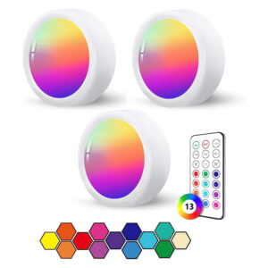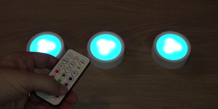 Donc là ces spots sont vendus par 3, et ce qui est bien c’est qu’une télécommande est fournie. Elle permet de contrôler jusqu’à 3 spots, ça tombe bien. On peut donc faire varier l’intensité, les couleurs, et en théorie ça fonctionne jusqu’à une distance de 8 mètres. Et comme pour la lampe déco qu’on a vue un peu plus tôt, il y a aussi des modes spéciaux pour faire clignoter les spots, faire quelques effets simples. Il y a même un timer pour éteindre automatiquement les spots au bout de 30 ou 60 minutes. Et si la télécommande tombe en rade, les spots sont aussi tactiles avec les fonctionnalités de base pour changer de couleur ou faire varier l’intensité. Donc des petits ajouts sympa pour ambiancer votre décor, et vous n’avez bien sûr pas l’obligation d’utiliser les trois, vous pouvez en garder un ou deux en réserve, voire en utiliser un pour vous donner un peu de couleur à la cam, on peut aussi faire ça.