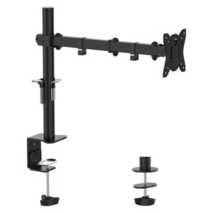 On termine avec un support pour écran, et là je dois l’avouer, il coûte plus que 25 €. Bon, à 99 centimes près, on va considérer que ça passe ? Bref, j’ai retenu ce bras pour écran parce qu’il avait de bonnes évaluations sur Amazon, et après l’avoir testé, je trouve qu’il est très solide et vraiment pratique. C’est le cas de tous les supports de ce type, puisque l’objectif est de libérer de la place sur le bureau, place habituellement occupée par le pied du moniteur dont on va pouvoir se séparer ici. Mais je confirme que ça permet d’alléger un bureau facilement.