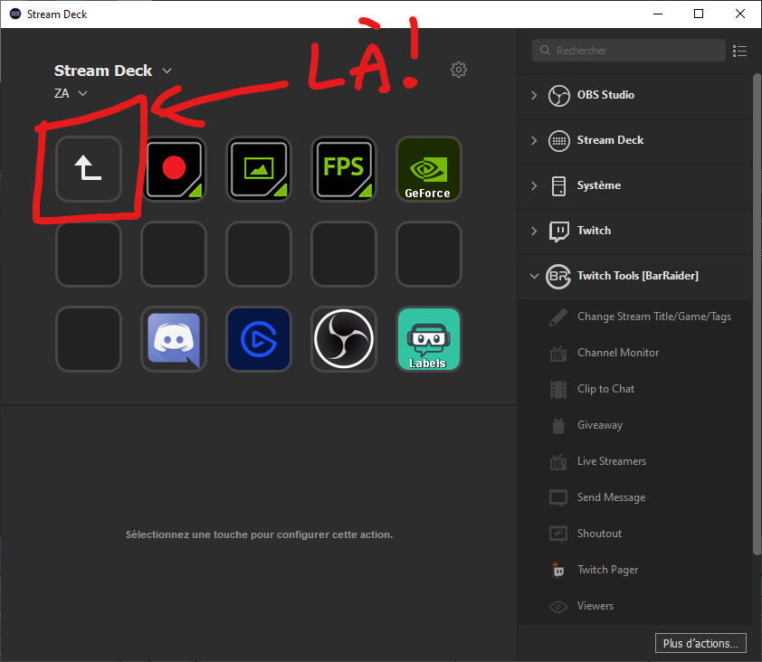 Ça c’est une fonctionnalité connue normalement, vous pouvez créer différents profils sur votre Stream Deck et passer de l’un à l’autre en ajoutant un bouton de profil. Par exemple je peux créer un profil pour mon stream avec tous mes actions Twitch, mes changements de scènes, etc, et quand je travaille sur l’ordi je peux créer un profil avec des raccourcis, des macros pour mon logiciel de montage vidéo, un bouton pour ouvrir Twitter…