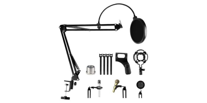 - Ensemble perche + filtre antipop + support anti-chocs + serre-câbles + adaptateur. C’est de l’entrée de gamme, mais j’ai un produit similaire et ça fait le job sans se ruiner.