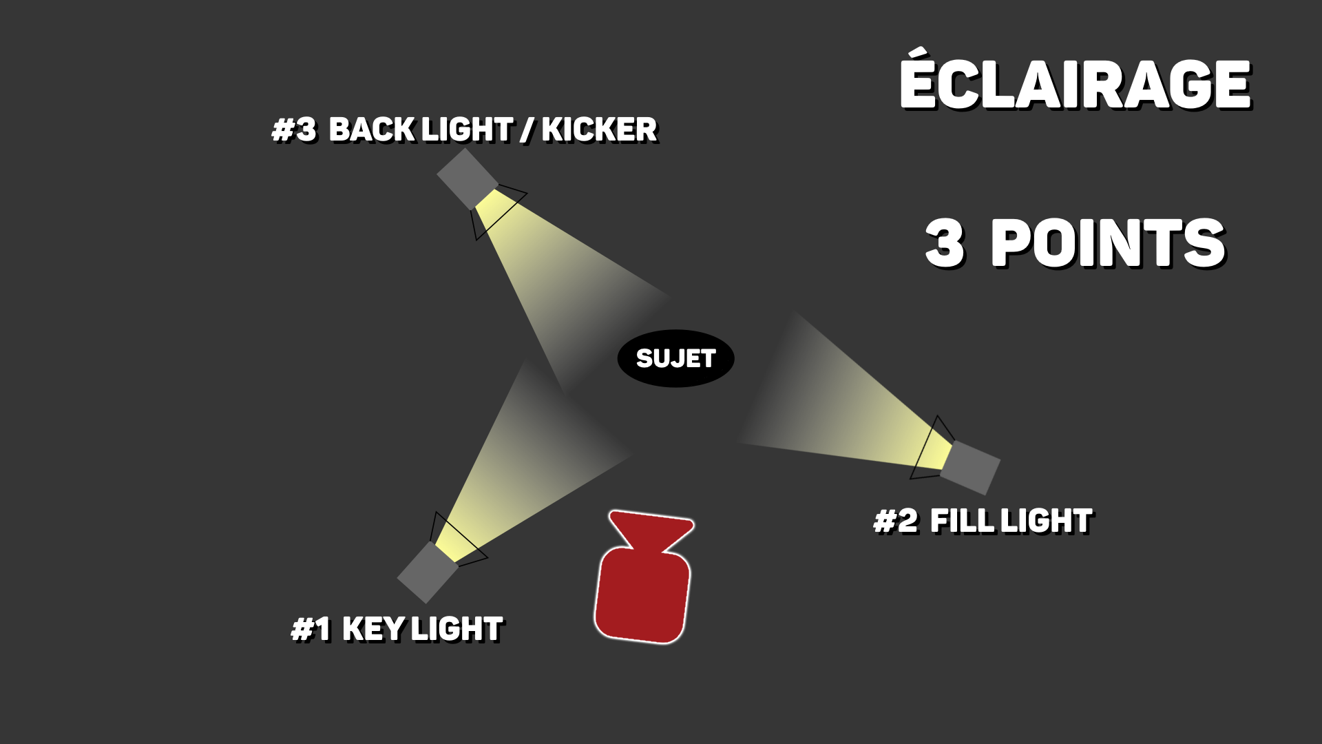 Dans l’idéal, on part sur un éclairage 3 points, au pire sur un éclairage 2 points, mais dans tous les cas, évitez de mettre votre lumière dans pile l’axe de votre caméra, essayez de la décaler un peu sur le côté, ça donnera un peu de relief à votre visage :