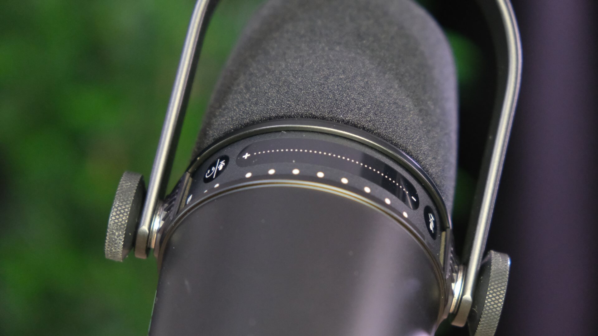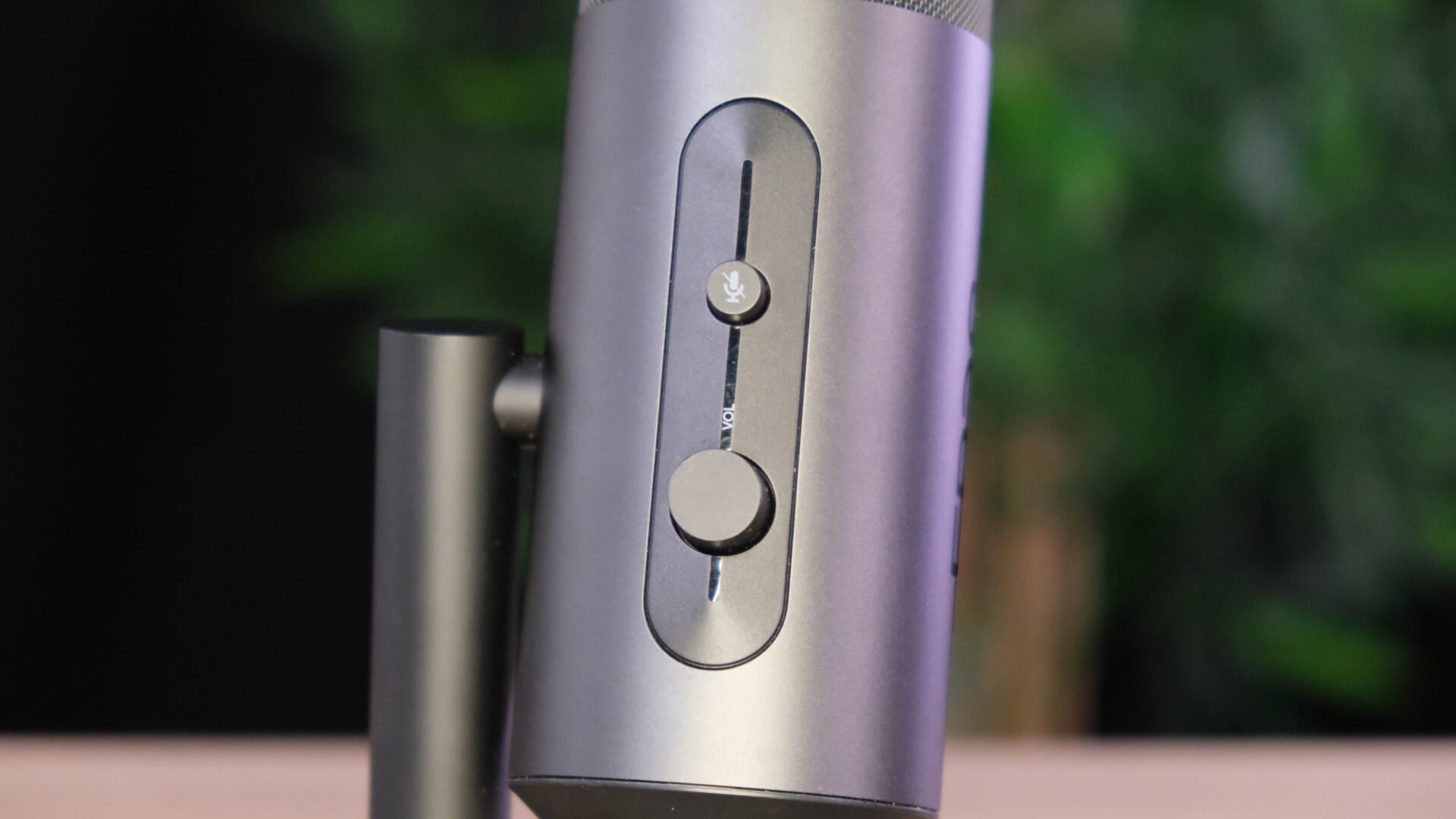 - finition métal, noir, design relativement épuré si l’on omet les 4 boutons qui dépassent du corps, avec un bouton pour couper le micro et un témoin lumineux juste au-dessus, un bouton pour le volume du monitoring, un bouton pour le volume du micro et un dernier pour choisir l’une des 4 directivités possibles, on trouve également une prise jack 3,5 mm sur le dessous pour brancher un casque