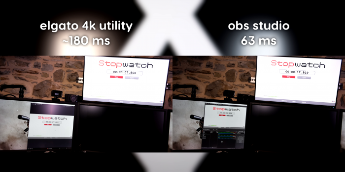 Pour le fun, j’ai refait l’expérience avec la capture cette fois-ci, donc avec l’affichage sur mon PC et le retour OBS sur mon PC de stream avec la HD60X branchée dessus, et là pour le coup il y a une petite latence, mais comme le signal transite par USB et non par HDMI, c’est normal. Et après plusieurs mesures, en moyenne j’ai observé une latence d’environ 180 ms entre la source et le retour sur l’appli Elgato, et de seulement 63 ms entre la source et le retour OBS, donc autant vous dire qu’à moins d’être un PGM, on peut carrément jouer sur le retour OBS !