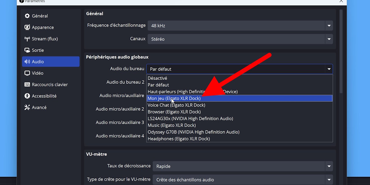 - Dans les paramètres d’OBS, menu Audio, ajouter la piste Music (Elgato), appliquer et valider.