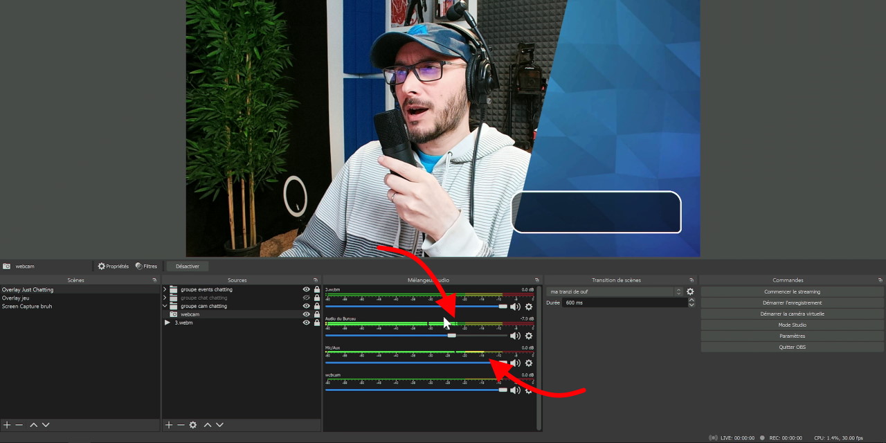 La qualité du micro, c’est bien, mais si le jeu est deux fois plus fort que le micro, c’est ballot. Pour avoir une référence, sur OBS le micro doit arriver dans la zone jaune du mélangeur audio, tout le reste dans le vert, et d’une manière générale on évite d’aller dans le rouge pour éviter les phénomènes de clipping et de saturation. Pour éviter ça on peut d’ailleurs utiliser un filtre de type Limiteur, qui est également inclus dans OBS.