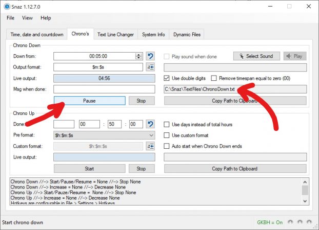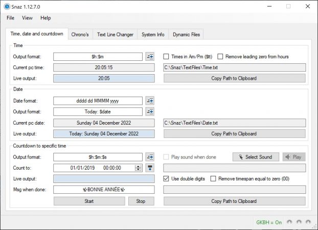 Sur SNAZ, dans l’onglet Chrono, c’est là qu’on règle la durée de 5 minutes. Le format de sortie peut paraître un peu bizarre, c’est juste qu’on peut utiliser des variables, par défaut on a $h:$m:$s donc pour les heures, minutes et secondes. Je règle la durée sur 5 minutes, je clique sur le bouton Start et là le logiciel crée automatiquement un fichier texte avec le compteur.