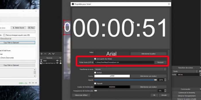 Ce fichier texte, je peux l’intégrer dans OBS. Donc déjà je peux copier l’emplacement du fichier. Ensuite, sur OBS, j’ajoute une source Texte dans la scène de mon choix, je la renomme au besoin, je coche la case « Lire à partir d’un fichier », je colle le chemin d’accès de mon compte à rebours, je clique sur OK, et c’est fini !