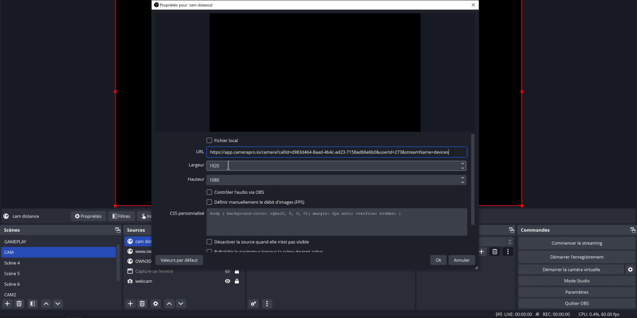 Mais on peut aussi et surtout utiliser cette méthode pour afficher plusieurs webcams sur une même scène, ça peut être pratique pour les streams de type talk show où les intervenants sont à distance. Il suffira qu’ils aillent sur CameraPro, qu’ils y activent leur caméra et qu’ils transmettent leur lien pour que l’hôte puisse ajouter les pov dans la scène de talk ! A priori pas de limite si ce n’est que bien sûr il faudra avoir une connexion capable de télécharger en temps réel tous les flux, et plus vous ajoutez de liens en provenance de CameraPro, plus il faudra un bon débit.