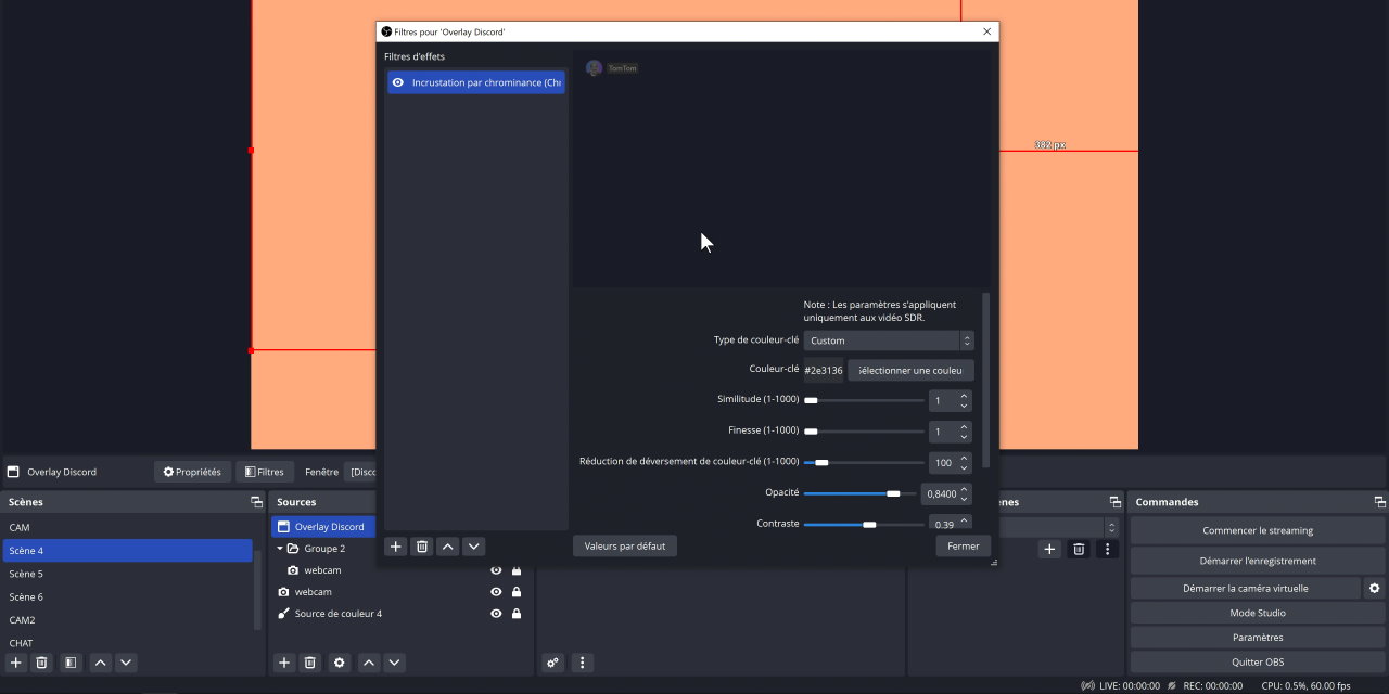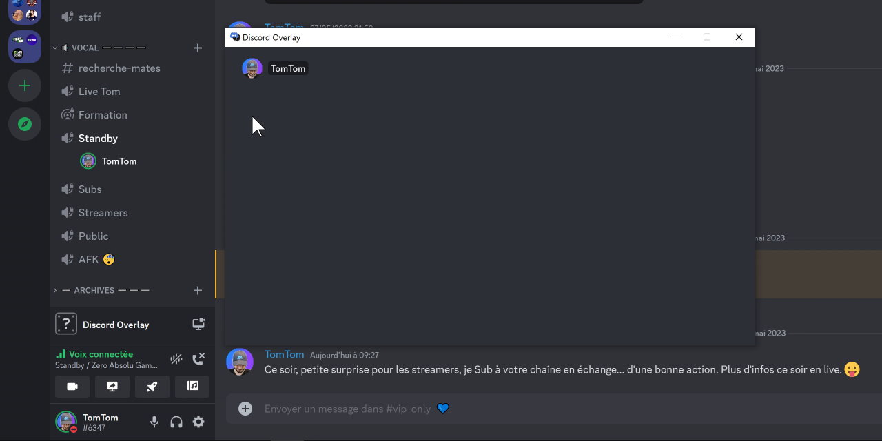Avec l’outil Discord Overlay, la détection se fera automatiquement, peu importe si vous changez de salon vocal, l’overlay sera toujours à jour et vos interlocuteurs seront toujours visibles sur l’overlay. Et la manip est simple, il suffit de télécharger et d’exécuter Discord Overlay, sur l’appli Discord il faudra activer l’option « Overlay en jeu » dans les paramètres utilisateur, et sur OBS on pourra ajouter une source Capture de fenêtre pour capturer Discord Overlay. Dernière étape, on va appliquer un filtre d’incrustation par chrominance avec les paramètres donnés sur la page de l’outil, c’est fini, on aura un overlay Discord qui se mettra automatiquement à jour au changement de salon !