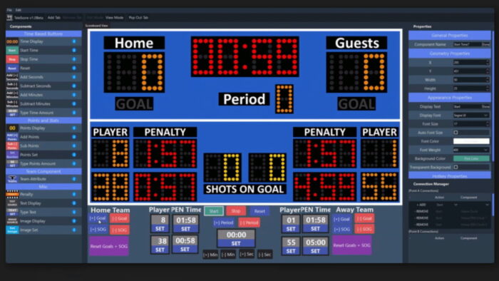 Ensuite je vous présente TeleScore, un outil qui intéressera ceux qui veulent afficher des scores divers et variés, que ce soit pour des rencontres sportives, des quiz ou carrément des événement d’esport ! L’outil se veut à la fois simple et complet. Simple par son utilisation avec le glisser-déposer intuitif, et complet par un nombre conséquent d’options avec par exemple des compteurs pour les points ou les scores divers, des comptes à rebours et autres timers, la possibilité d’intégrer des images, du texte, et bien sûr des raccourcis clavier qu’on pourra associer à n’importe quel compteur ou fonctionnalité.