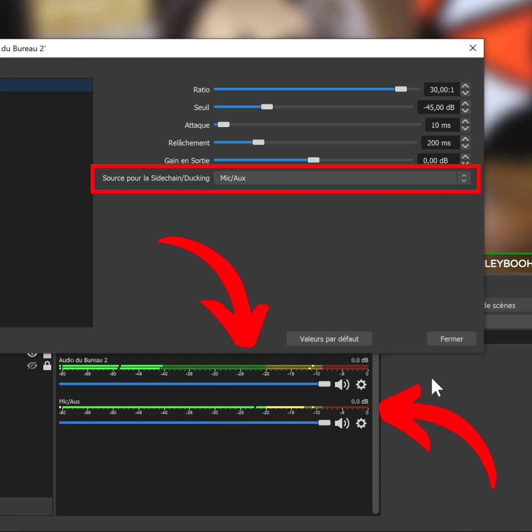 Ensuite clic sur la roue crantée et on va ajouter un filtre sur cette source audio, un filtre Compresseur, on choisit la source pour le ducking, donc notre micro c’est très important, on fait quelques réglages rapides comme vous pouvez le voir à l’écran, vous pouvez les reprendre ils fonctionneront avec la plupart des configurations.