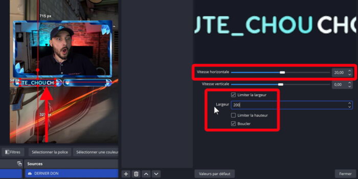 - Limiter la largeur (exactement comme si je définissais une taille personnalisée dans les propriétés de la source) → le texte défile et reste dans son cadre.