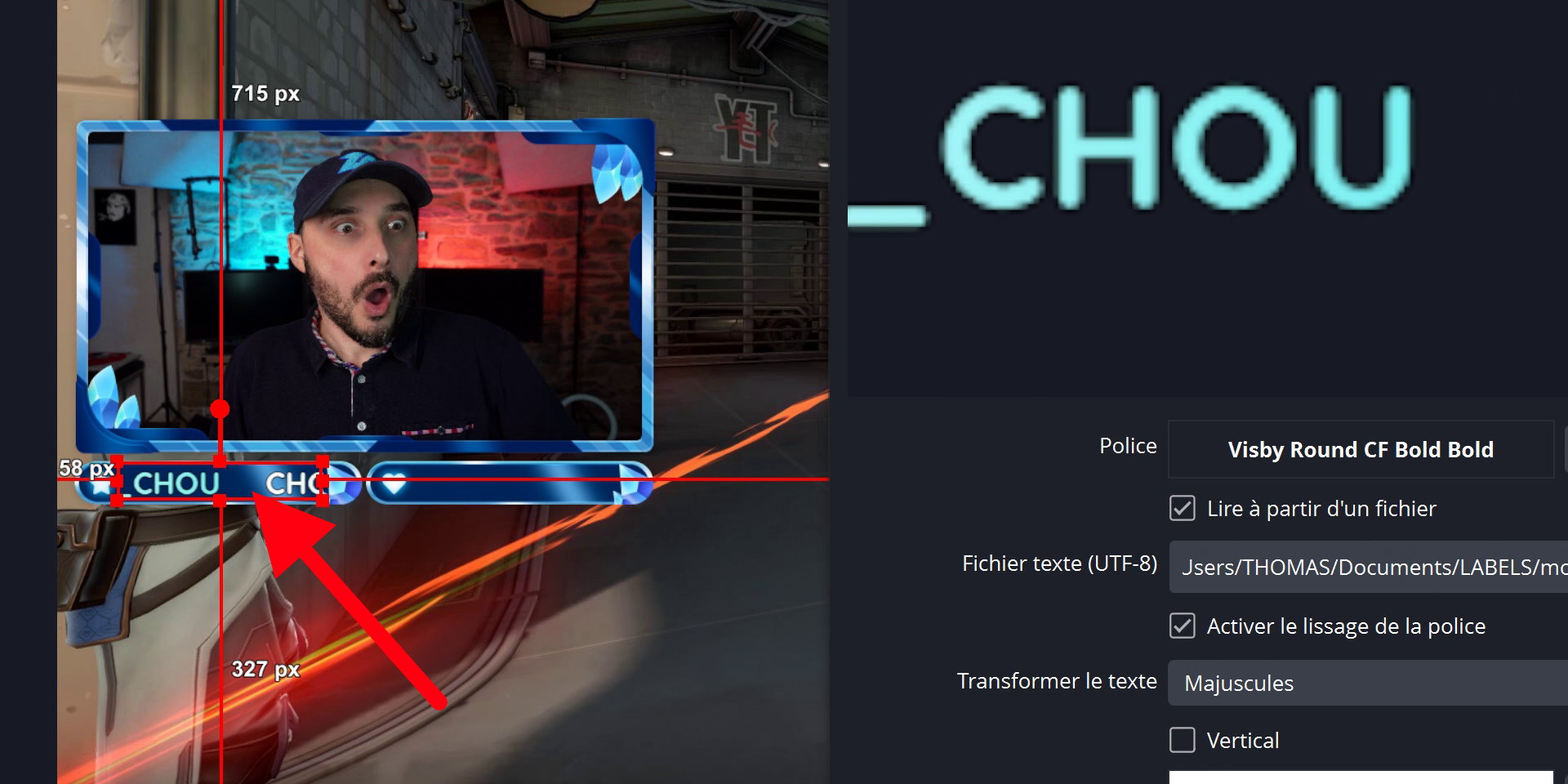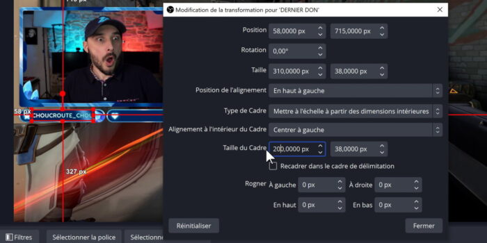 Une troisième méthode existe en cas de pseudo trop long, et c’est personnellement ma préférée. Elle consiste à adapter automatiquement la taille du texte à celle du cadre. Pour cela, j’ai laissé le format par défaut du le fichier most_recent_donator.txt, donc sans espaces, et ensuite il a fallu :