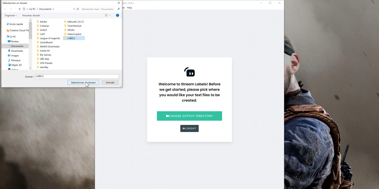 - cliquer sur Parcourir et aller dans le dossier utilisé pour Stream Labels