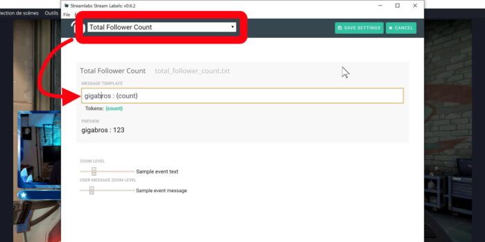 Pour personnaliser le texte, il y a deux choses à savoir. Déjà on peut modifier le format du texte en lui-même, sur l’appli il faudra cliquer sur la roue crantée et on pourra choisir un fichier à modifier. Par exemple, si je veux que mon nombre total de followers soit précédé d’un petit texte, je modifie le format sans toucher à la variable, j’enregistre les modifications, et ça apparaîtra directement dans OBS et donc sur votre live.