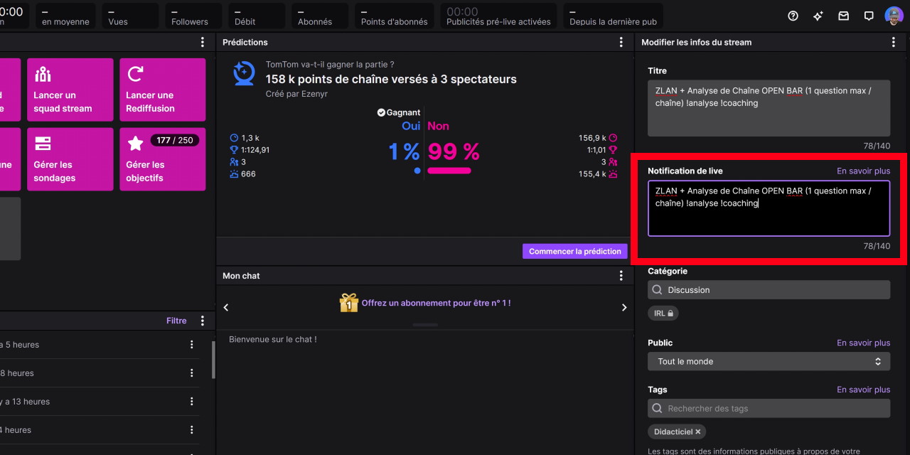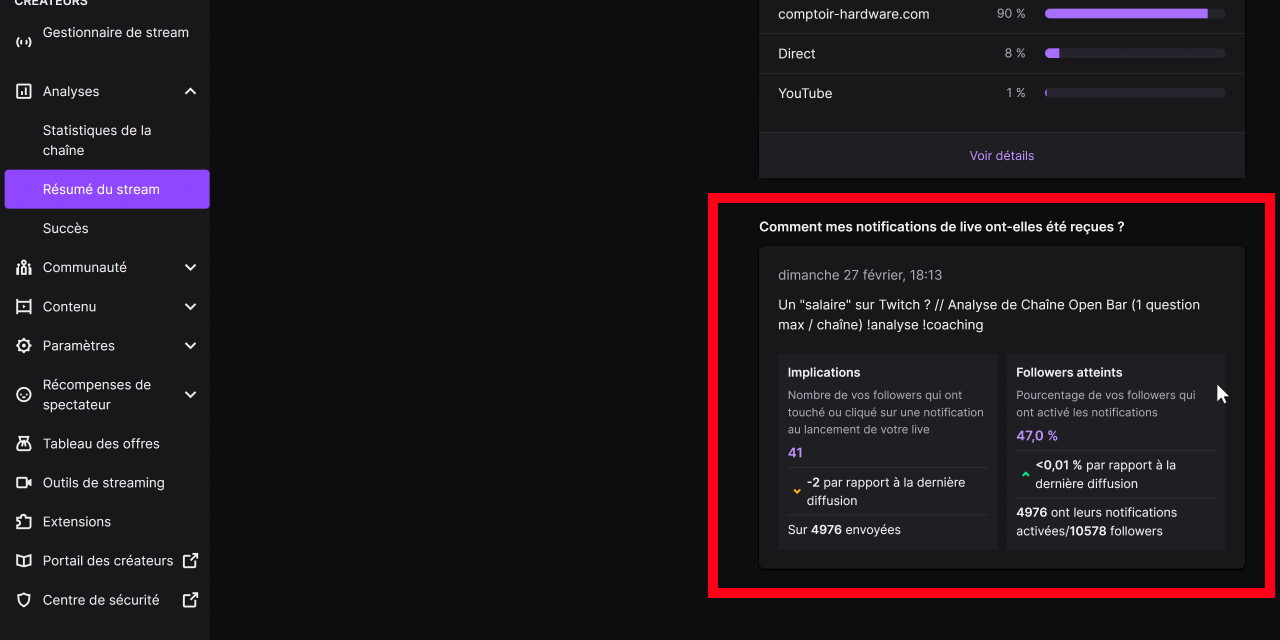 - Texte des notifications : quelque chose qu’on néglige trop souvent, c’est le texte des notifications de live. Ce texte est visible sur les notifications qui sont envoyées aux viewers qui suivent votre chaîne et qui ont activé les notifications. Ce sont d’ailleurs des chiffres que vous pouvez voir dans le résumé de votre dernier stream, avec le pourcentage de followers atteints et le nombre d’implications, i.e. le nombre de followers qui ont cliqué sur une notification. Bref, quand vous choisissez votre titre, pensez à bien copier/coller votre titre en tant que texte de notification, ça vous permettra d’étudier par la suite ce qui fonctionne et ce qui ne fonctionne pas. Personnellement je me sers pas mal de cet outil pour voir comment mes follower réagissent et je trouve que c’est trop souvent négligé, mais pour le coup c’est une statistique plutôt sympa à prendre en compte.