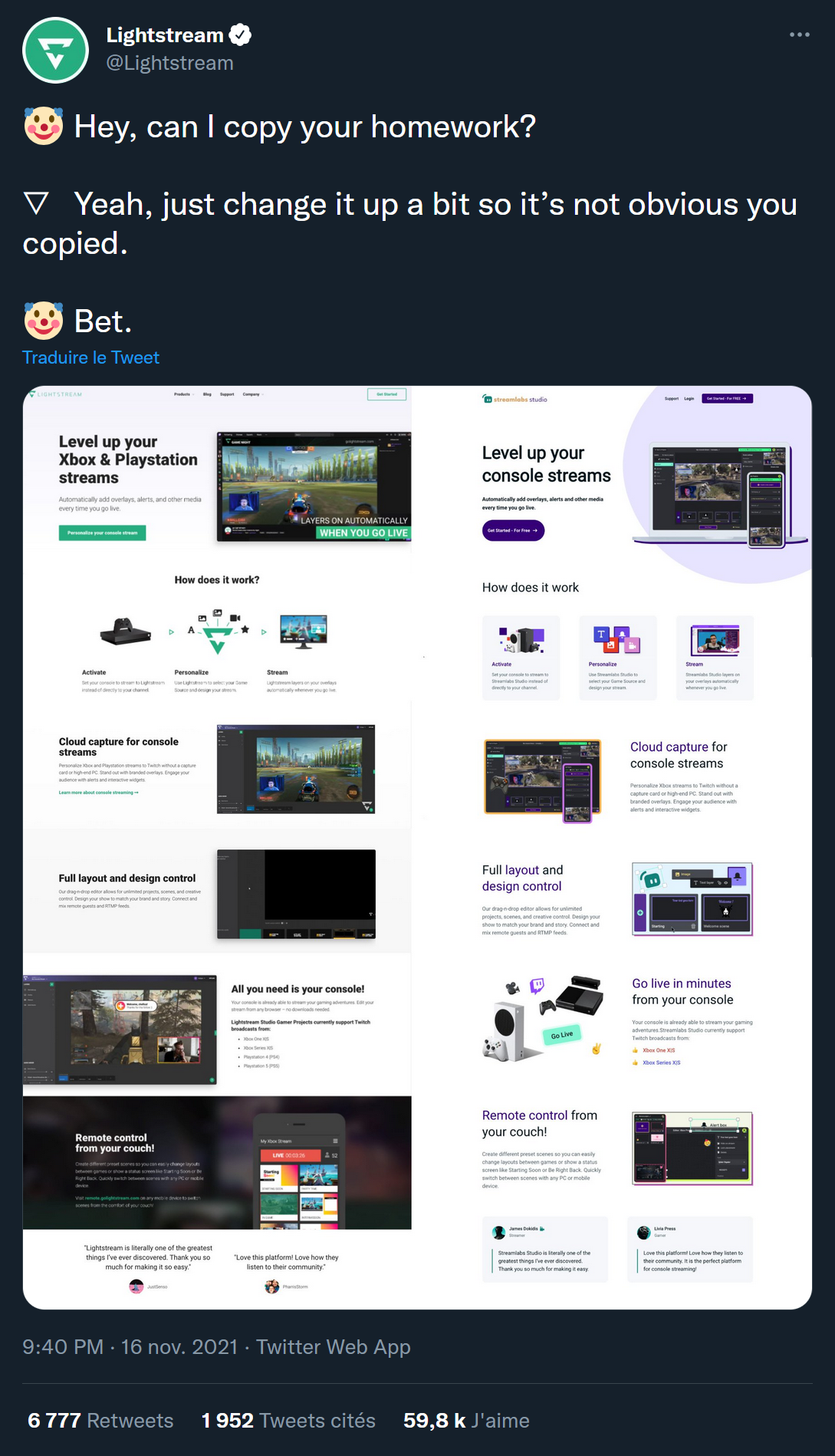 Et la sauce, justement, Streamlabs est en plein dedans ! Car si vous n’avez pas suivi l’histoire, tout est parti d’un simple tweet. Streamlabs a récemment sorti un nouveau service appelé Streamlabs Studio, qui est fortement inspiré de LightStream, qui existe déjà depuis quelques temps. Bon, on se dit que ce n’est pas bien méchant, c’est du business, sauf que le site internet qui présentait le nouveau service de Streamlabs était littéralement un copié/collé de celui de LightStream, jusqu’à avoir exactement les mêmes textes au mot près ! Du coup Streamlabs s’est justifié en disant que ce n’était pas la version définitive du site, tout ça…