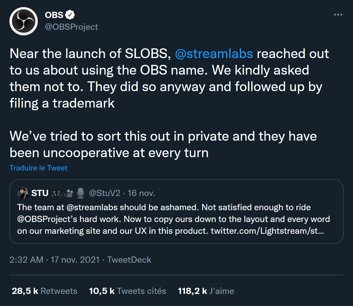 Ça aurait pu s’arrêter là, mais en réponse au tweet de LightStream mettant en lumière ce plagiat, d’autres sociétés leur ont emboîté le pas, dont des grosses boîtes comme Elgato qui a pointé du doigt l’appli Streamlabs Deck, qui est un Stream Deck pour SLOBS. Mais évidemment le plus gros buzz vient du compte Twitter officiel d’OBS, qui a ressorti un vieux dossier comme quoi Streamlabs les avait contactés avant le lancement de Streamlabs OBS, et OBS avait demandé à Streamlabs de ne pas utiliser le terme OBS dans le nom de leur logiciel. Chose que n’a évidemment pas faite Streamlabs, qui n’a rien fait d’illégal évidemment, ils avaient le droit. Mais quand on sait le travail qu’il y a derrière le développement d’un projet libre comme OBS, vouloir profiter du nom pour jouer sur la confusion des gens qui pourraient penser que les deux sont liés, ou pour favoriser l’apparition de Streamlabs dans les résultats de recherche sur Google quand on tape « OBS », je veux bien qu’on me dise « business is business » mais ça manque quand même de classe. A fortiori quand on base son logiciel sur de l’open source qui a une mentalité un peu plus ouverte que le simple mercantilisme. Enfin bon, les faits sont là, libre à vous de juger ça avec votre propre regard.