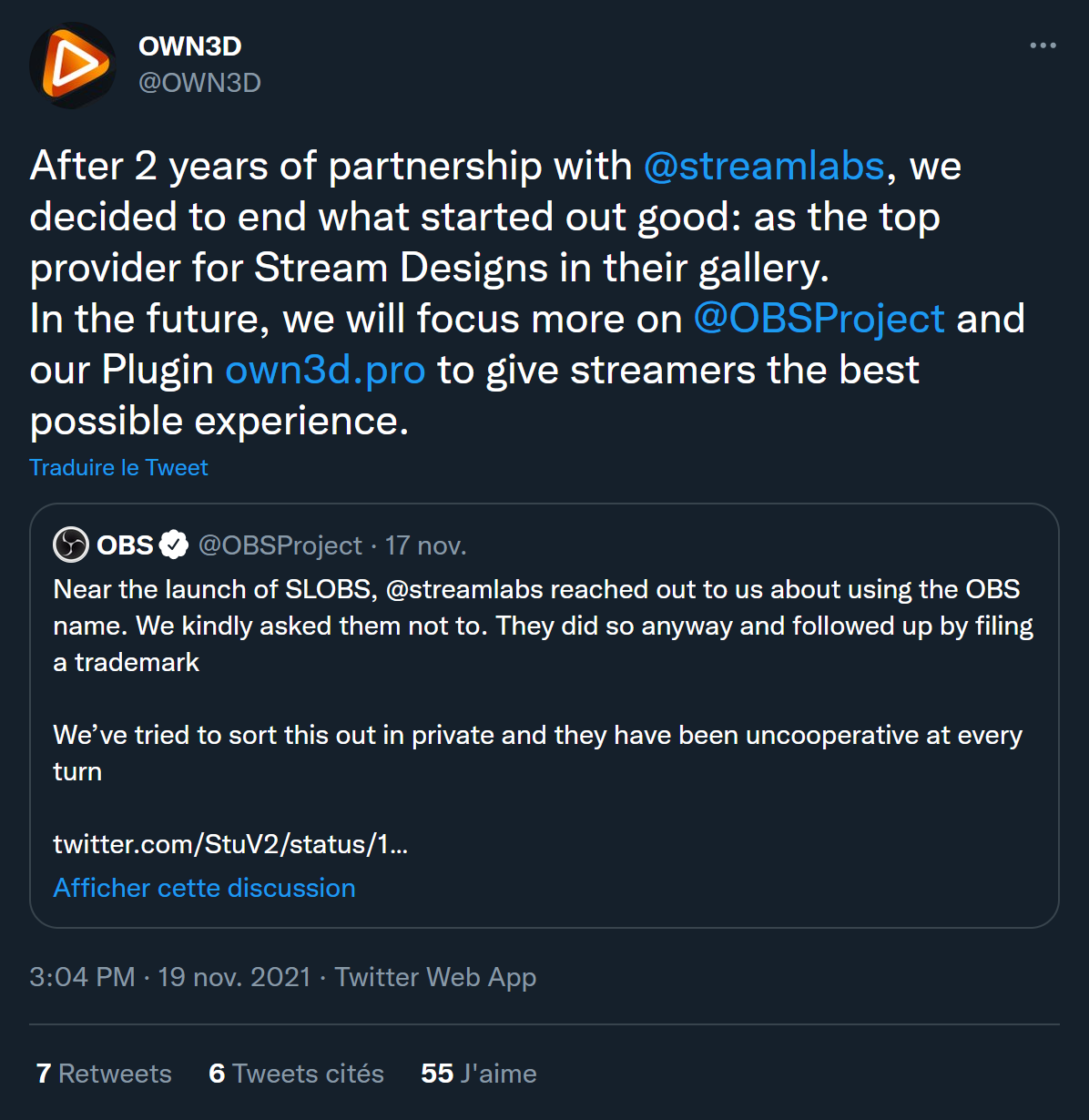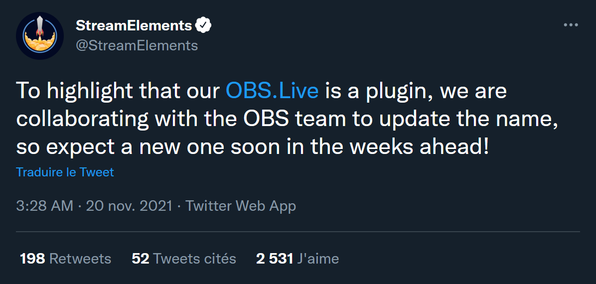 Et donc après toutes ces histoires, Streamlabs a décidé de changer le nom de son logiciel, qui est bien parti pour s’appeler désormais Streamlabs Desktop… Au passage, StreamElements a annoncé qu’ils allaient changer le nom de leur plugin OBS.Live, mais dans une démarche quand même un peu plus saine. On apprend également que OWN3D, que vous connaissez bien maintenant vu qu’ils sponsorisent 50 % des vidéos de la chaîne, va cesser son partenariat avec Streamlabs, donc vous n’aurez plus aucun overlay de chez eux avec l’abonnement Streamlabs Prime… Bref, Streamlabs a pris cher, mais Streamlabs survivra. Mais pour ceux qui voudraient en profiter pour passer à OBS Studio, eh bien c’est peut-être le moment !