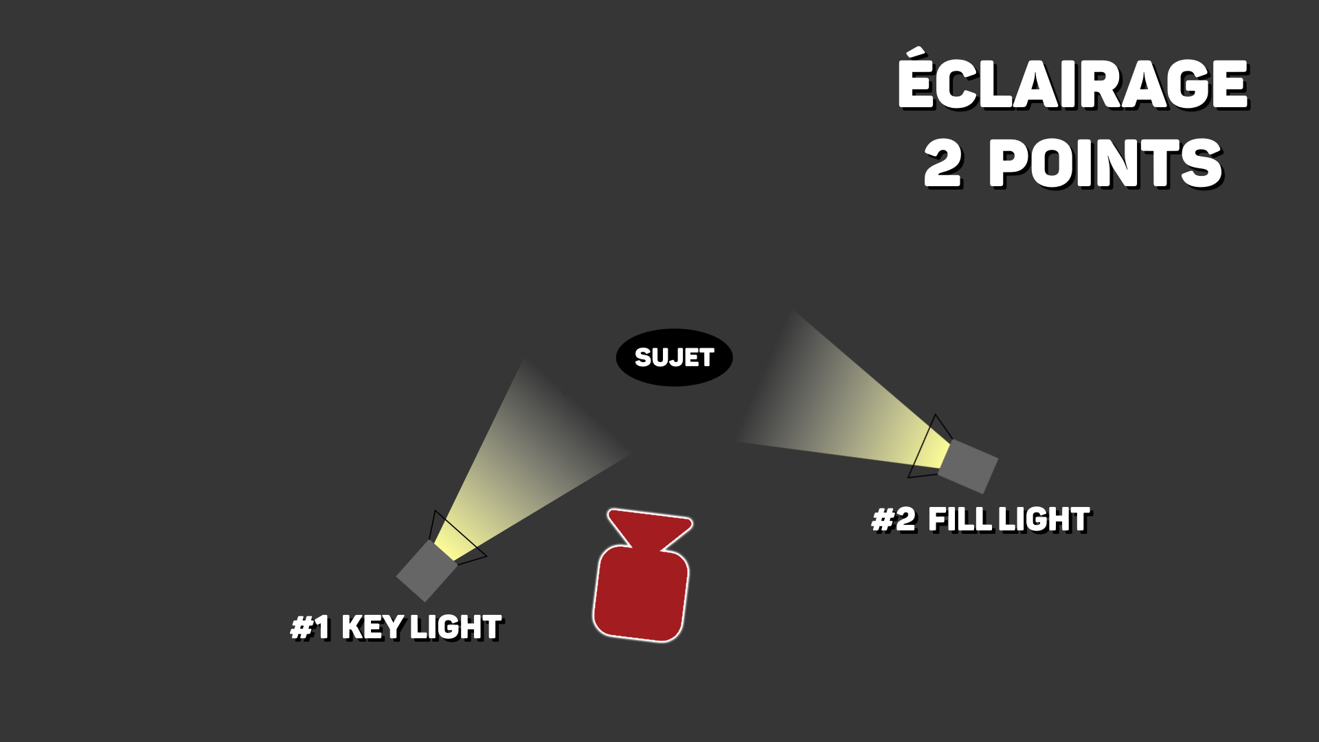 - Pour un éclairage 2 points, vous avez donc la lumière principale ou key light un peu décalée face à vous, notez que la caméra aussi est un peu décalée, pour du streaming c’est plus sympa, pour des vidéos YouTube vous pouvez la laisser bien face à vous. Et vous avez une seconde lumière , la fill light, qui vient atténuer les ombres et qui est placée de l’autre côté mais davantage sur le côté que la key light.