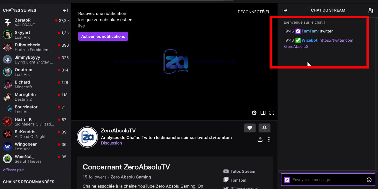 Et au final, toutes les annonces seront faites régulièrement dans le chat, de quoi rappeler à vos viewers qu’ils peuvent vous suivre sur les réseaux sociaux par exemple, évitez juste d’envoyer une annonce toute les 3 minutes, laissez un minimum de temps ou de messages entre chaque annonce pour ne pas spammer le chat.
