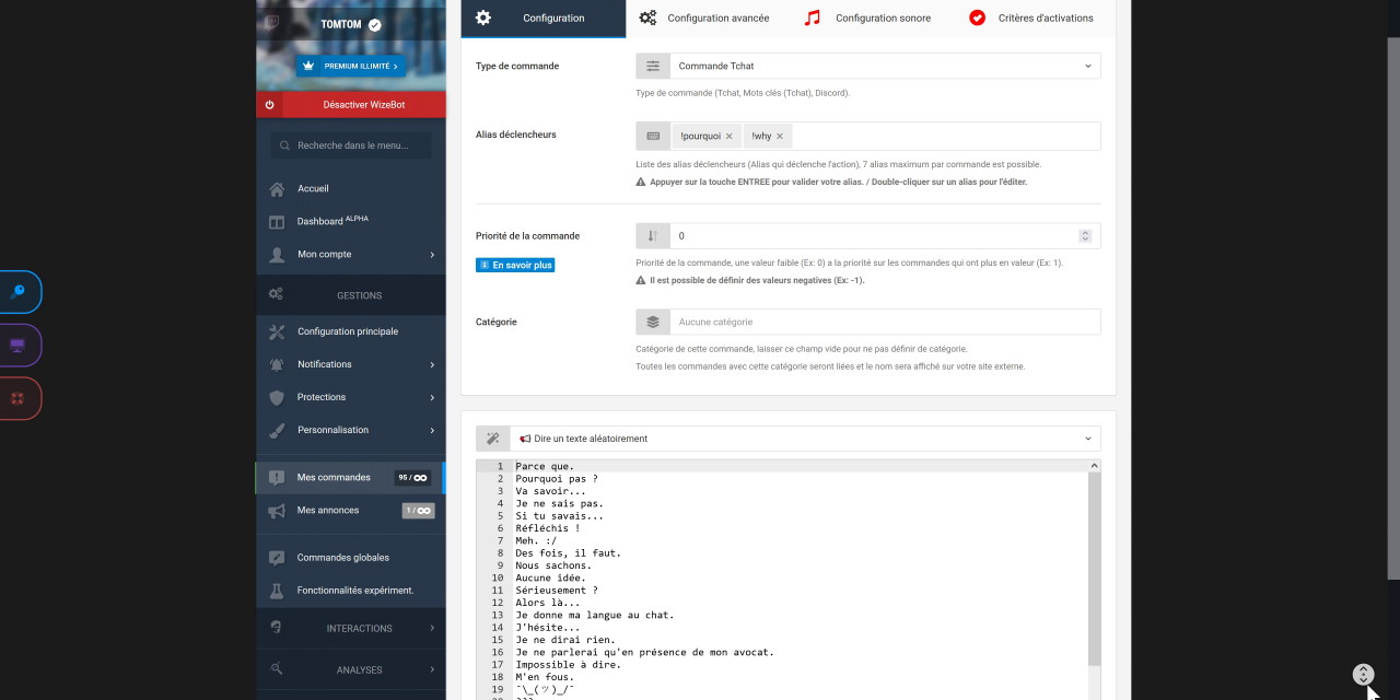 - Commande en elle-même : en réponse à un alias déclencheur, le bot peut effectuer plusieurs types d’actions : afficher un texte simple, une action (qui au final est un texte en italique), jouer un son, afficher un texte aléatoire, une action aléatoire, des options premium…