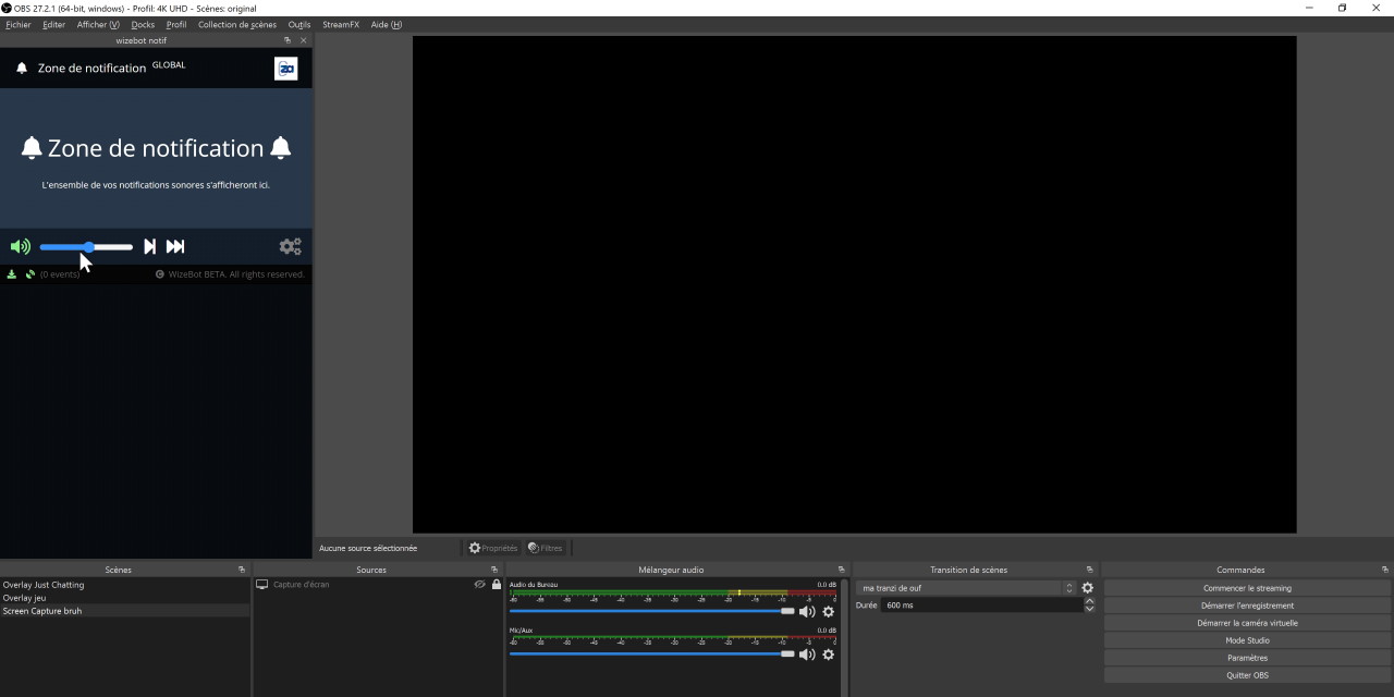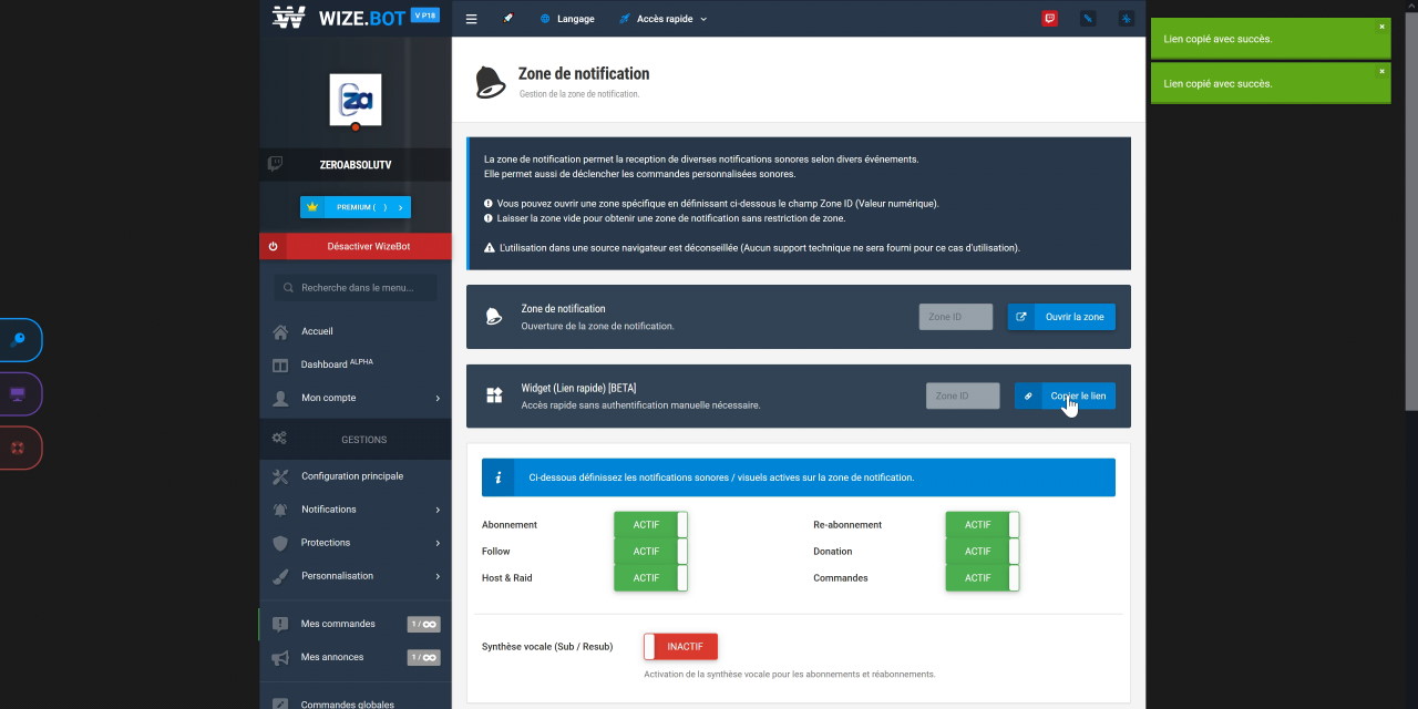 Mais on va revenir et terminer sur la fameuse zone de notification, qui permettra de jouer les sons qui sont déclenchés par Wizebot, si jamais vous en avez définis, par exemple pour les notifications ou certaines commandes. On la trouve dans les outils et on a deux options : soit on l’ouvre directement et il faudra la garder ouverte quelque part sur l’ordi, soit on peut utiliser le lien de widget en cliquant sur le bouton « Copier le lien », et sur OBS on va pouvoir ajouter un dock internet personnalisé, donc via le menu Dock, on donne un nom à ce dock, on colle le lien du widget Wizebot, on applique, et on pourra avoir ce dock et le caler sur notre OBS, ça servira donc de zone de notification et du coup ça sera directement inclus dans OBS, c’est plutôt pratique.