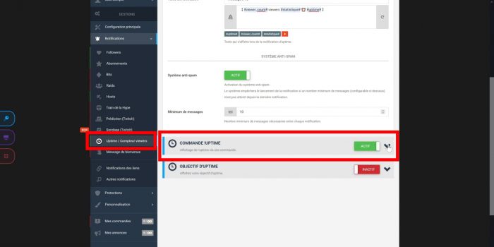 En revanche une commande qui va nous intéresser c’est la commande !uptime. Si vous l’activez, ça permettra aux viewers de savoir depuis combien de temps le live est lancé. Il y a encore pas mal de viewers qui utilisent cette commande, donc c’est sympa de l’activer, et enfin vous avez un objectif d’uptime, personnellement je ne m’en suis jamais servi, mais si vous voulez en définir un, c’est ici.