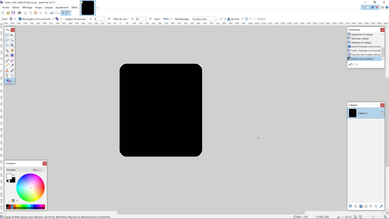 - Sur le logiciel Paint.NET, je crée une image aux dimensions 640×720, je vais mettre un fond noir uniquement pour voir le cadre blanc, je le supprimerai après, ensuite je crée un nouveau calque pour travailler au-dessus du fond noir, je vais prendre l’outil de forme et choisir la forme rectangle avec coins arrondis, je règle l’épaisseur du trait sur 6 pixels, la taille des coins sur ce que je veux, par exemple 50, je choisis la couleur blanche et je dessine ma forme. je supprime mon fond noir et j’ai déjà fait un cadre pour mon fond de chat.