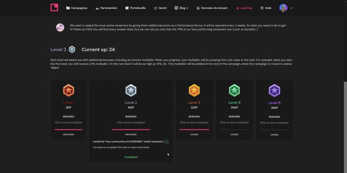 Notez également que quand vous êtes dans le menu des campagnes, vous avez un récap dans la partie supérieure, avec notamment un point sur l’état de votre niveau, votre level. Pour plus d’infos vous pouvez cliquer dans le menu du haut sur « Level Up », vous aurez une explication en anglais sur comment ça fonctionne, mais en gros, plus vous montez en level, plus vous gagnerez avec les pubs grâce à un multiplicateur. Vous pouvez aller jusqu’au Level 5 avec un boost de 35 %. Donc si vous êtes Level 5 quand une campagne se termine, vous gagnerez 35 % de plus. Plus vous utilisez InStreamly, plus vous montez en level, c’est réinitialisé régulièrement et pour débloquer le niveau 3 il faudra installer l’extension InStreamly dans vos panneaux de chaîne. Ce n’est absolument pas obligatoire, mais ça fait un petit plus qui ne vous coûte rien là non plus, donc si ça vous intéresse, il suffit de continuer à utiliser InStreamly.