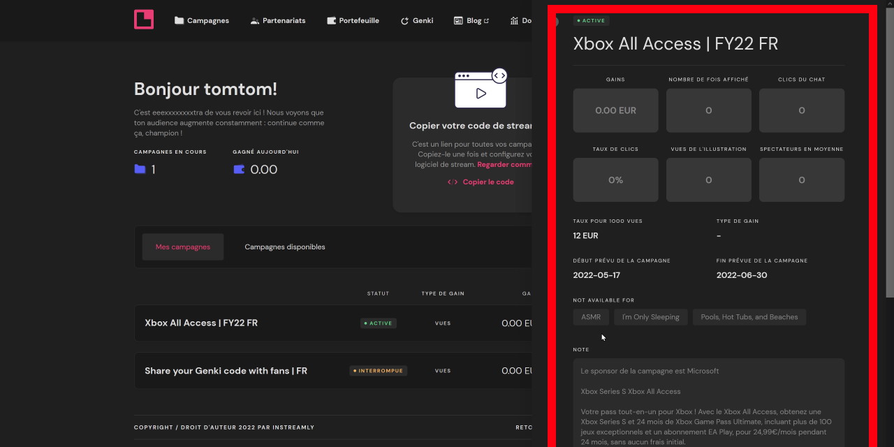 Déjà, il va falloir s’inscrire sur le site InStreamly, ensuite vous allez pouvoir vous identifier avec la plateforme de votre choix, en l’occurrence Twitch. Identifiez vous, donnez les autorisations, et vous arriverez sur votre tableau de bord. Pour commencer à afficher des campagnes sur votre stream, c’est simple, cliquez sur « Campagnes disponibles » et vous verrez toutes les campagnes en cours. Certaines campagnes ne rapportent pas d’argent, exemple avec les campagnes pour promouvoir le Pride Month et pour promouvoir Genki, qui est un autre service d’InStreamly. Mais il y a aussi évidemment des campagnes qui rémunèrent, exemple avec la campagne Xbox ici, où il est précisé qu’elle rapporte 12 € pour 1000 vues.