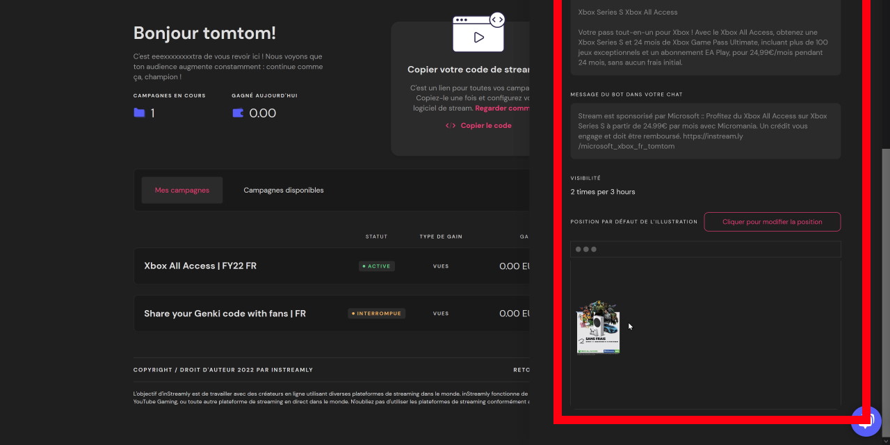 Donc pour l’instant il n’y en a pas beaucoup et elles sont très sélectives, tout le monde ne peut pas y participer, mais j’ai posé la question à un membre du staff et les campagnes GPP seront développées davantage à l’avenir, c’est une certitude. Et plus on sera nombreux à utiliser InStreamly, plus les annonceurs seront intéressés, plus il y aura de campagnes, effet boule de neige !