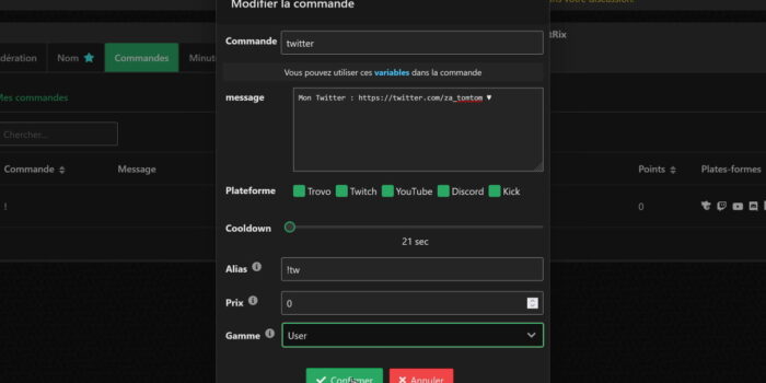- Entrez le message que doit afficher BotRix « Mon Twitter : https://twitter.com/za_tomtom »