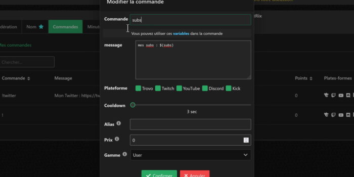 - Choisissez qui peut utiliser la commande (n’importe qui, follower, sub, modérateur…)