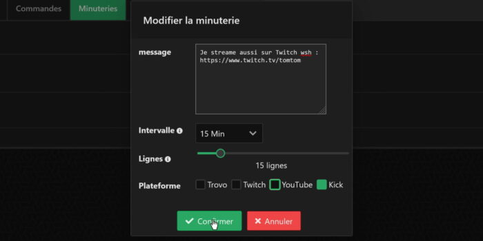 - Plateforme : comme pour les commandes, on peut définir sur quelle plateforme l’annonce sera active, nous ce qui nous intéresse c’est Kick, donc on veille à ce que la case soit bien cochée