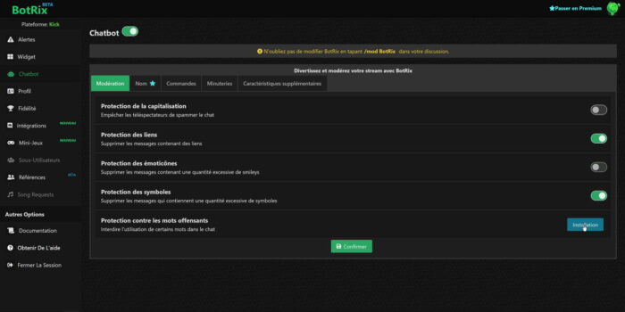 Dans l’onglet Modération, il n’y a pas énormément d’options pour l’instant, je rappelle que BotRix est en bêta, donc c’est du On/Off et il n’y a pas de réglages fins.