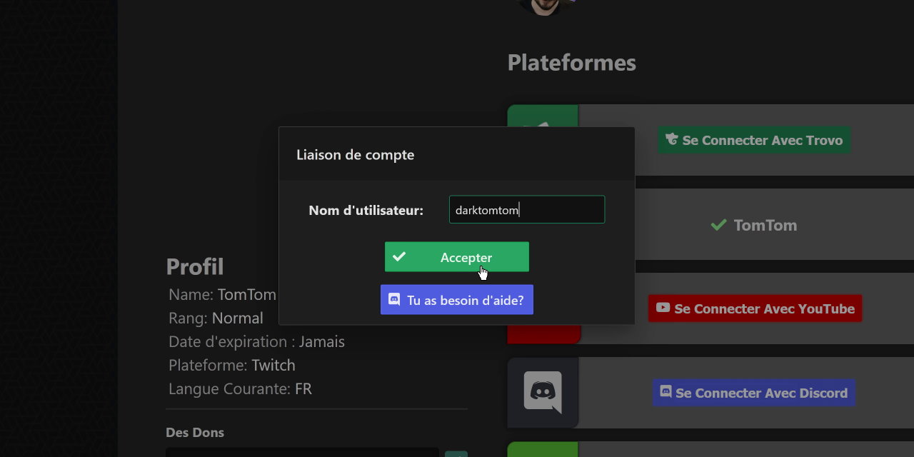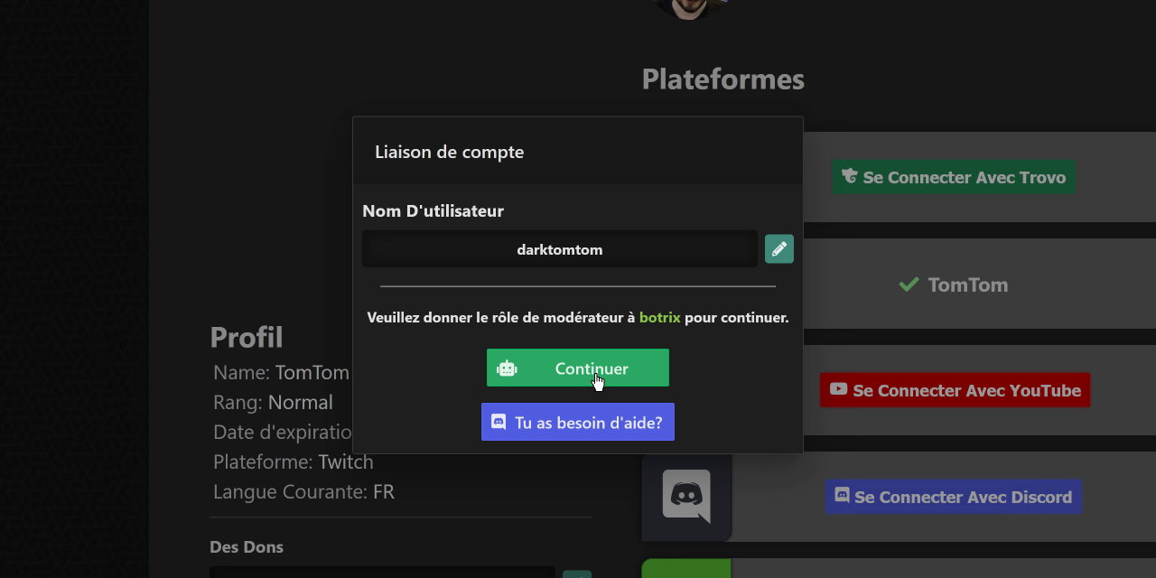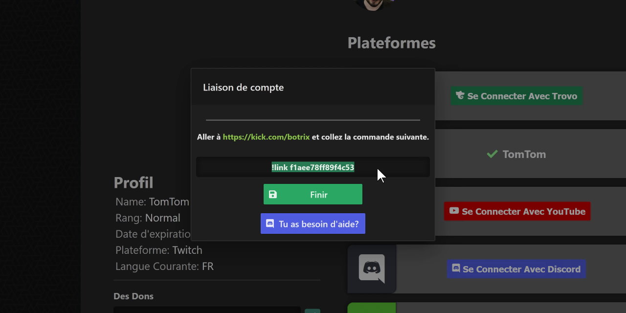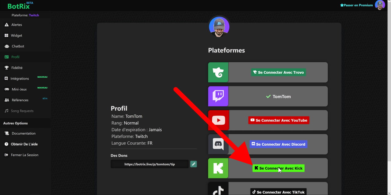 La première chose à faire, c’est de lier BotRix à votre chaîne Kick :
