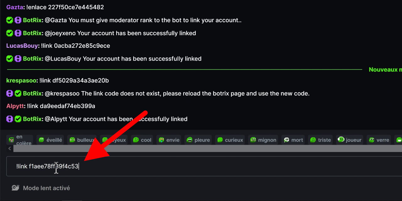 - Retournez sur le site BotRix, on vous demande d’aller sur la chaîne Kick de BotRix pour taper une commande dans le chat, copiez la commande, allez sur la chaîne Kick de BotRix, collez la commande dans le chat et le lien entre BotRix et votre chaîne Kick sera effectif.