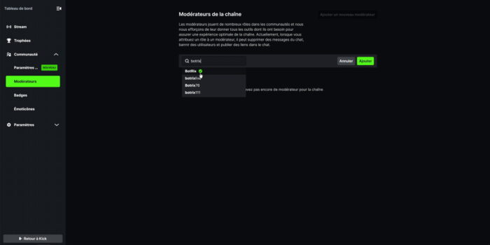 - Cliquez sur le bouton « Continuer », ce qui vous amène sur votre Tableau de bord Kick, sous-menu « Modérateurs ».