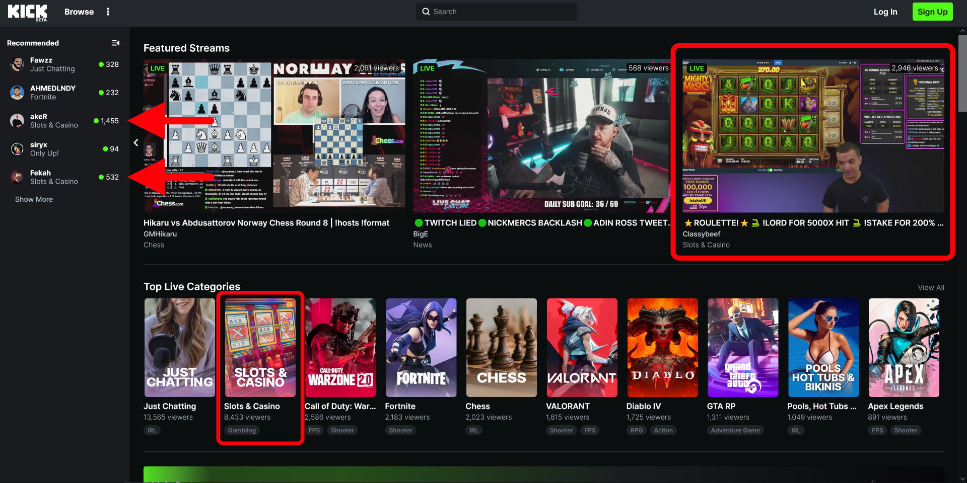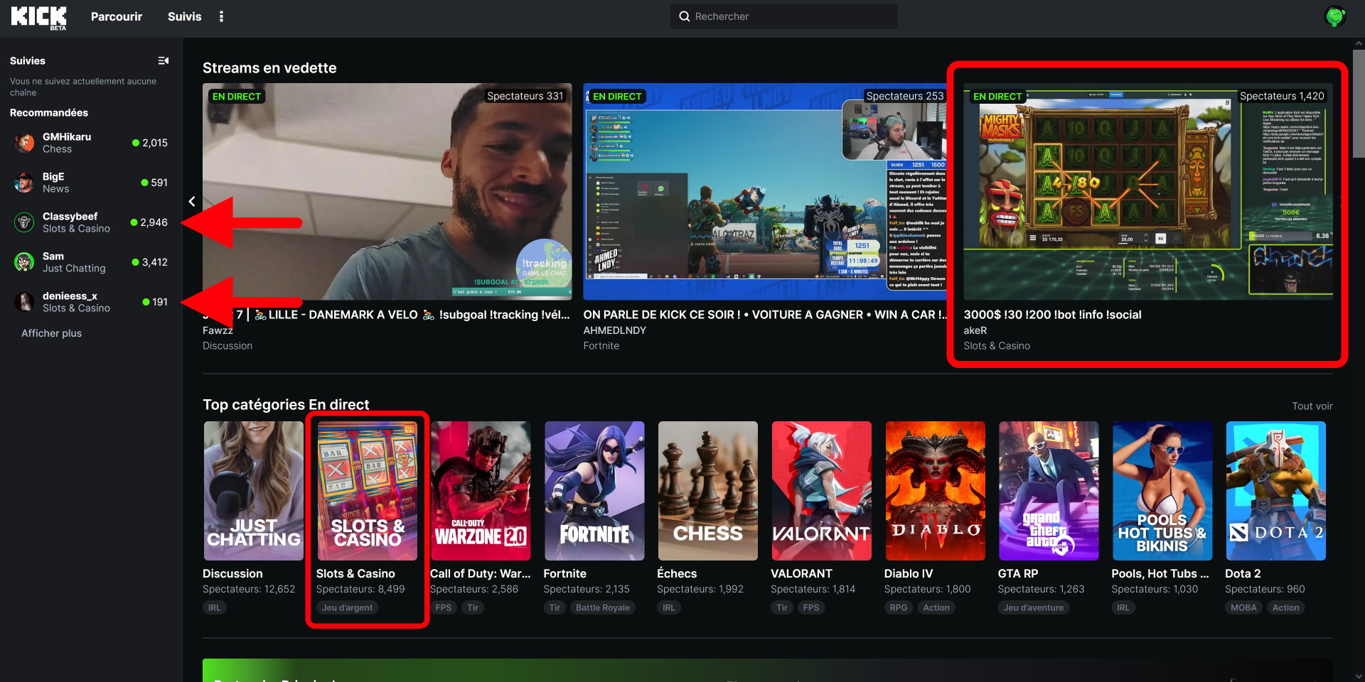 Et aujourd’hui, il y a Kick, une alternative qui vaut ce qu’elle vaut, j’en ai parlé dans une vidéo précédente. Mais c’est une alternative. À court terme selon moi, et il faut quand même accepter de baigner dans l’univers des casinos en ligne qui sont omniprésents sur la plateforme, n’en déplaise à certains, il suffit de regarder la page d’accueil, que ce soit en logué ou en anonyme, absolument tout est fait pour mettre en avant les streams casino, c’est une réalité.