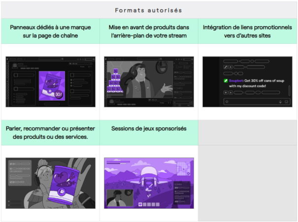 Donc à terme on imagine que ça remplacera les hashtags #ad ou #sponsored. Et pour savoir quel type de contenu est considéré comme étant sponsorisé ou promotionnel, il y a une page d’aide sur le site Twitch qui donne quelques exemples de ce qui remplit les critères ou non.
