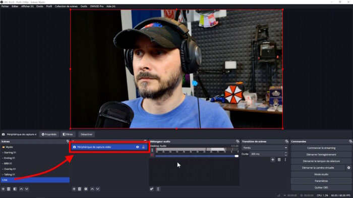 Je vais ajouter ma webcam, donc après avoir vérifié qu’elle était bien branchée, je vais créer une nouvelle scène dans OBS pour y mettre uniquement ma cam en plein écran, j’ajoute donc une source « Périphérique de capture vidéo » et je choisis ma webcam.