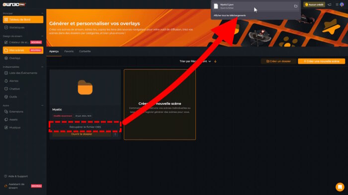Une fois ce fichier télécharger, je vais sur OBS → menu Collection de scènes → Importer, et là je vais simplement aller chercher le fichier .json que je viens de télécharger, je l’ajoute, je lance l’importation et dans mes collections de scène j’aurai alors la collection Mystic.