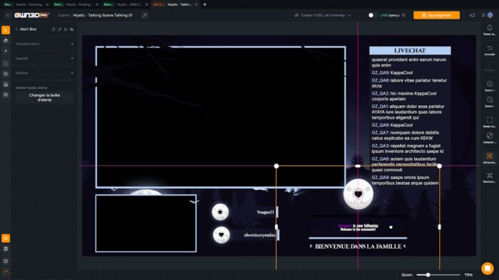 Pour la scène de discussion, le résultat de base est plutôt sympa, je vais juste augmenter un peu la taille du texte dans le chat histoire qu’on voit un peu mieux. Ensuite, je vais supprimer des labels pour ne garder que ceux indiquant le dernier Sub et le dernier follower et je les place à côté de là où sera ma webcam, en essayant de les aligner au mieux. Je vais également placer les alertes un peu en bas pour remplir l’espace, je lance une alerte test pour voir où ça va arriver, j’ajuste la position, ça me convient, je vais donc enregistrer le tout et passer à la suite.