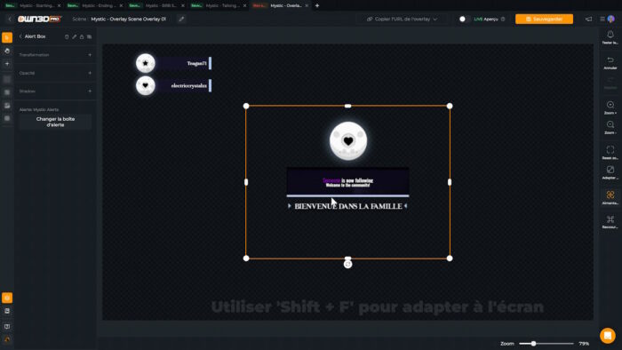 Quand j’ai choisi mon overlay, on m’a proposé d’ajouter les alertes correspondantes, du coup j’ai des alertes à configurer, ce que je vais faire maintenant. Dans le menu Alertes, je vais choisir les alertes Mystic et activer toutes celles qui m’intéressent et commencer à les personnaliser.