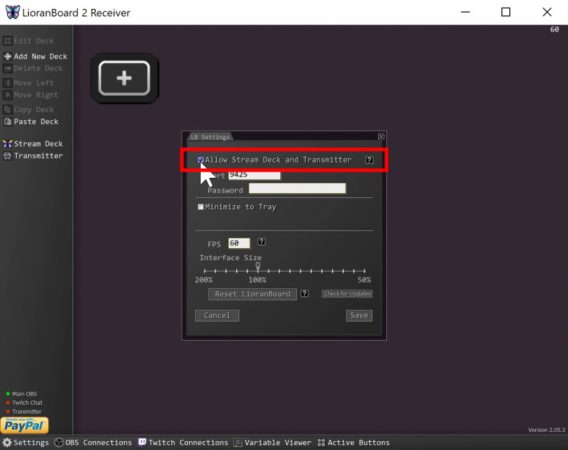Retour sur LioranBoard rapidement pour aller dans les Settings et cocher la case « Allow Stream Deck and Transmitter », on ne touche pas au reste pour plus de simplicité. Vous aurez peut-être un message du pare-feu de Windows pour ajouter une autorisation, faites-le, et là normalement le transmitter s’est connecté tout seul et vous devriez avoir le point vert en bas à gauche de LioranBoard. Alors attention, vous devez toujours garder le dock Transmitter ouvert dans OBS, sinon la liaison sera coupée, faites bien attention à ça.