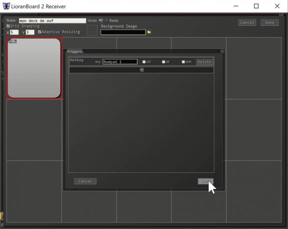 - bouton « + », j’ajoute un raccourci avec l’option « Hotkey », je choisis la touche 1, je sauvegarde à nouveau mon bouton, puis je sauvegarde mon deck, et c’est fini !