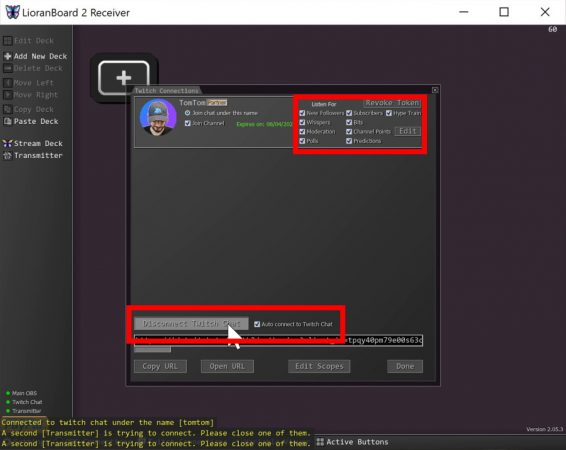 Dernière étape avant de commencer à jouer avec l’appli, lier son compte Twitch. Sur LioranBoard, on va cliquer sur « Twitch Connections », puis sur le bouton « Open URL », qui ouvrira un onglet dans votre navigateur pour accorder les permissions nécessaires. On clique sur « Autoriser », évidemment, et on aura un message nous disant de retourner sur LioranBoard, ce qu’on va donc faire.