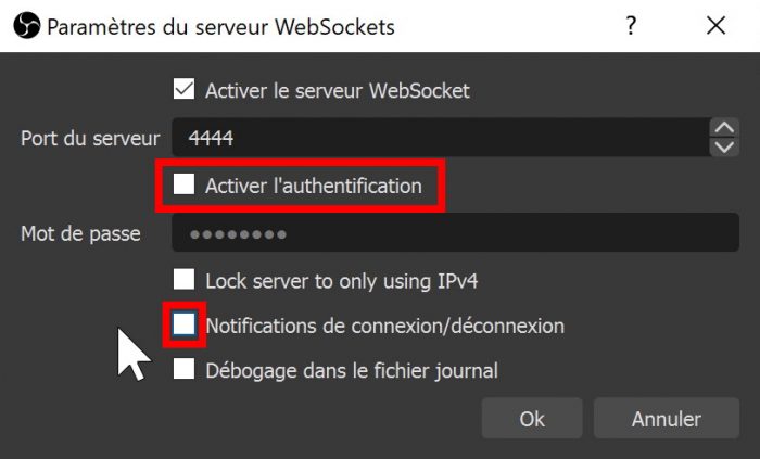 Ensuite si on va sur OBS, dans le menu « Outils », on va pouvoir modifier les paramètres de serveur websocket. Pour simplifier les démarches, je décoche la case « Enable authentification », du coup j’aurai un message d’avertissement, je valide. Je décoche les notifications au passage, et c’est bon pour websocket.